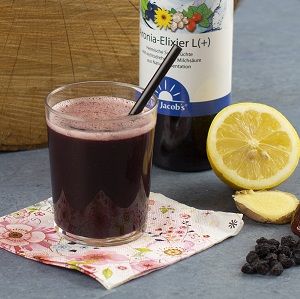 Für alle die Milchsäure mal „lecker“ zu sich nehmen wollen, ist das ein optimales Rezept. Aromen die von süß über sauer, von bitter über fruchtig, alles zu bieten haben. Aronia-Elixier L(+) mit einem Konzentrat aus Aronia- und Holunderbeeren, Topinambur, Hagebutten und Acerolakirschen liefert den fruchtig-aromatischen Geschmack, Ingwer die Würze und Datteln eine leichte Süße. Herrlich erfrischend und voller Vitamine!