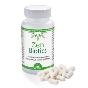 Zen Biotics® von Dr. Jacob's Medical kombiniert 7 synergistisch aufeinander abgestimmte Bakterienstämme aus Laktobazillen und Bifidobakterien mit den Power-Sporen Bacillus subtilis und Bacillus coagulans sowie GABA, L-Glutamin, Niacin und Pantothensäure. Das Ergebnis ist eine innovative Formulierung, die gezielt an der Schnittstelle von Darmgesundheit und psychischem Wohlbefinden* ansetzt.