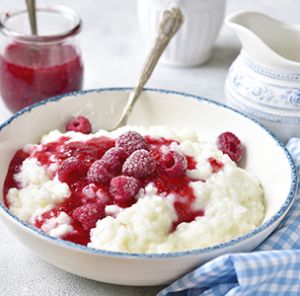 Wir kennen ihn schon aus Kindertagen und er hat von seiner Beliebtheit nichts eingebüßt: Cremiger Milchreis (in unserem Fall mit leckerer Kokosmilch) trifft auf eine fruchtige Haube aus Himbeeren. Köstlich!
