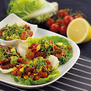 Gemüse mit Tofu in Romanasalatblättern anrichten und mit Blutdruck-Salz abschmecken. Gemeinsam mit Tomaten-Avocado-Salat auf einem Teller anrichten und mit Kresse dekorieren.